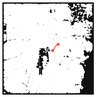 # Explore graph edges and route together in a single maproute_edges = ox.routing.route_to_gdf(Gs, path, weight='length')m = edges.explore(color="black", tiles="cartodbdarkmatter")m = route_edges.explore(m=m, color="maroon", style_kwds={"weight": 5})# Add the Esri World Imagery tile layerfolium.TileLayer( tiles='https://server.arcgisonline.com/ArcGIS/rest/services/World_Imagery/MapServer/tile/{z}/{y}/{x}', attr='Esri', name='Esri Satellite', overlay=False, control=True).add_to(m)# Add a layer control to toggle between tile layersfolium.LayerControl().add_to(m)m