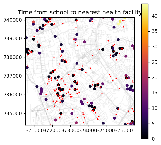 # Map the travel time from each school to the nearset health facility - darker dots are closer to a health facility, red dots are health facilities# construct geodataframegeometry = gpd.points_from_xy(nearest_df1['longitude'], nearest_df1['latitude'])nearest_gdf = gpd.GeoDataFrame(nearest_df1, geometry=geometry, crs='EPSG:4326')edges_plot = edges.to_crs(epsg=4326)health_plot = health_fac.to_crs(epsg=4326)# Plot with length column for travel timefig, ax = plt.subplots(1, 1, figsize=(5, 5), dpi=120)edges.plot(ax=ax, color='grey', alpha=.1, zorder=1)health_fac.plot(marker='+', color='red', legend=True, ax=ax, markersize=5, zorder=3)nearest_gdf.plot(column='length', cmap='inferno', legend=True, ax=ax, markersize=25, zorder=2)plt.title("Time from school to nearest health facility")ax.set_xlim(bbox_3857[0], bbox_3857[2])ax.set_ylim(bbox_3857[1], bbox_3857[3] )plt.show()